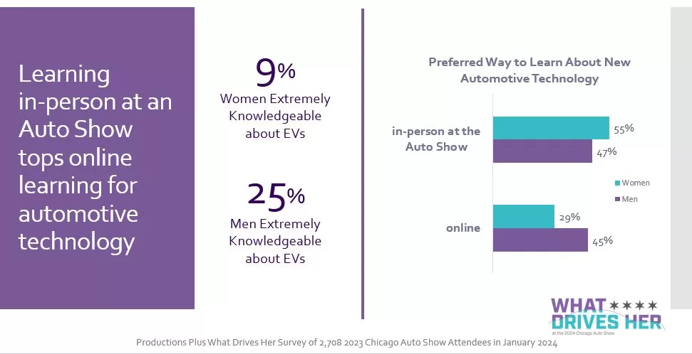 The gender dynamics of auto purchasing were a focal point of our study. A significant 55% of female respondents identified the auto show as their preferred platform for learning about new car technologies. This insight is particularly enlightening, underscoring the event’s role in empowering female car buyers—a demographic historically underserved by the traditional dealership model.